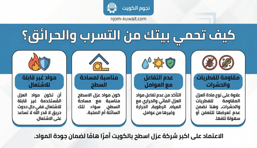 - أن تكون مواد العزل المُستخدمة غير قابلة للاشتعال، ففي حال حدوث حريق لا قدر الله لا تساعد على الاشتعال.